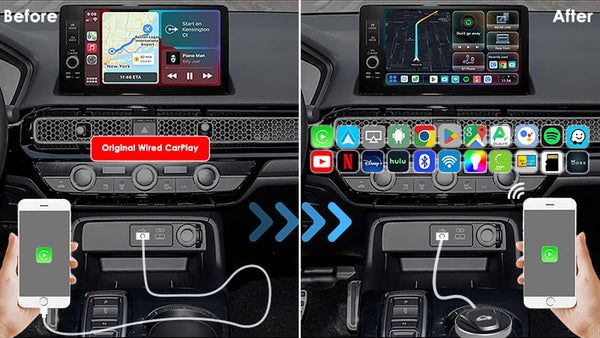The USB CarPlay adapter will helps to change car original wired CarPlay | Android Auto to wirelsss CarPlay | Android Auto.