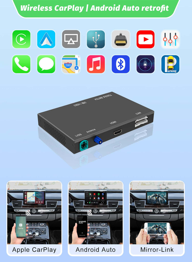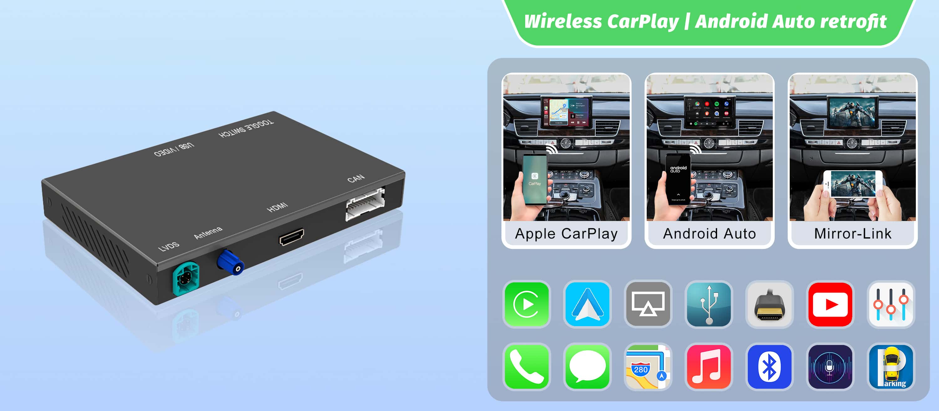 This is the wireless Apple CarPlay + Android Auto + Mirroring retrofit kit.