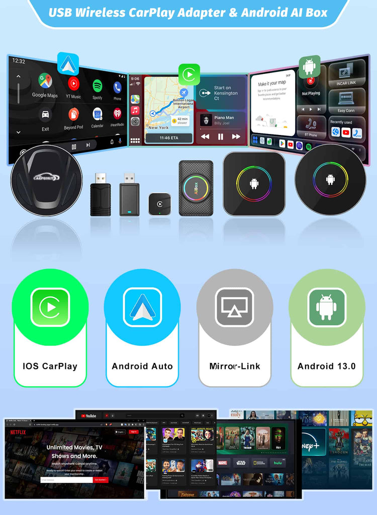 The Wireless CarPlay AI box will helps to change car original wired CarPlay to wireless CarPlay + Android Auto + Android system working on car original screen.