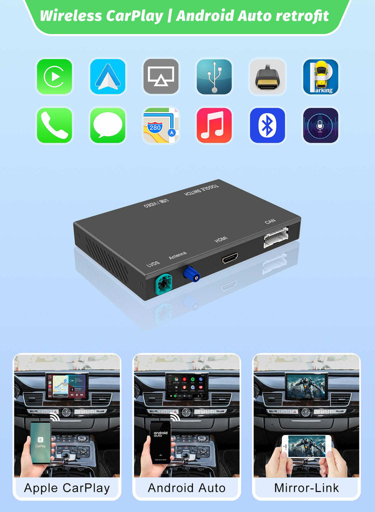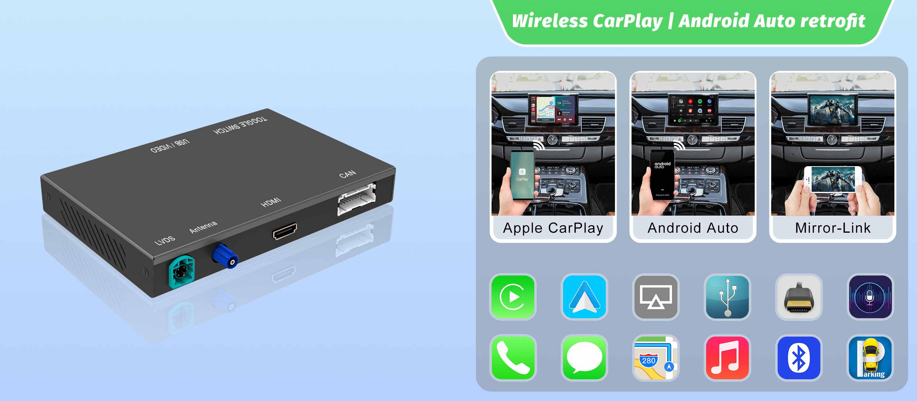 This is the wireless Apple CarPlay + Android Auto + Mirroring retrofit kit.