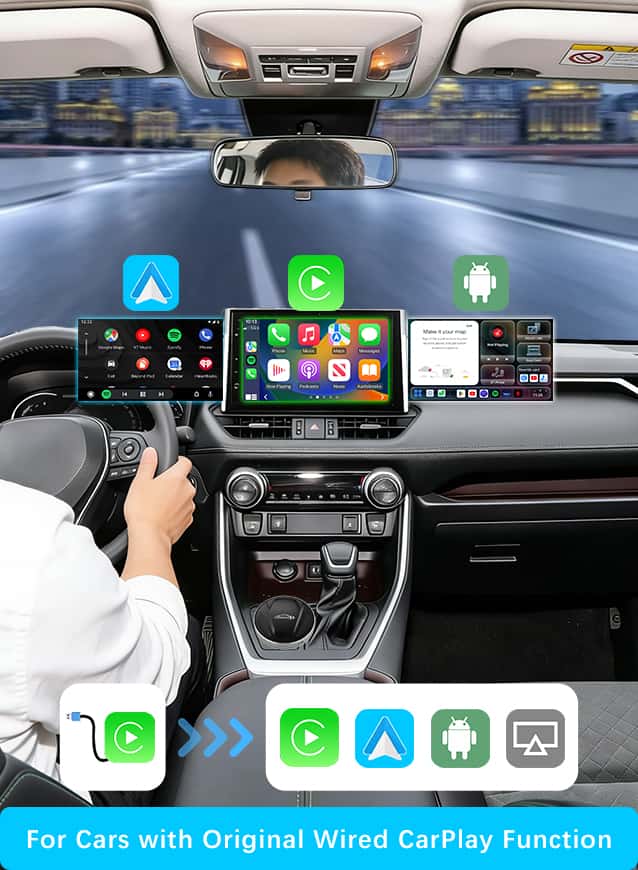 The Wireless CarPlay AI box will helps to change car original wired CarPlay to wireless CarPlay + Android Auto + Android system working on car original screen.